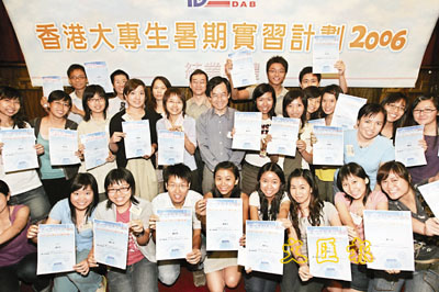 民建聯06年大專生暑期實習計劃圓滿結束,一班「學滿師」的年青學員昨日齊集中華總商會舉行結業禮,不少民建聯「大哥大姐」,例如副主席葉國謙、副主席譚惠珠、青年民建聯總監蘇錦樑、青年民建聯主席張國鈞,以及民建聯培訓委員會主席馮培漳等均畀面出席,與年青人分享喜悅。