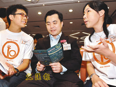 ■「童夢同想」的成員向律政司司長黃仁龍(中)介紹活動情況。 本報記者李志樑 攝