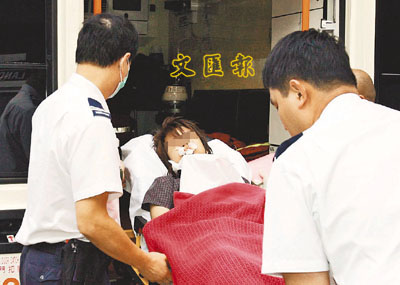 救護員接報到場,替傷者敷治時,在旁女子情緒激動不停催促,並陪同「男友」送院。當救護車抵達醫院,她又不停叫救護員「快搵救我條仔啦!」其間有記者在場拍照,她即向記者大罵:「唔好影死我條仔!」。稍後,其「男友」經治療後離開,得知女友曾與記者爭執,反著女友向記者道歉,女子見未獲「男友」支持,大為不滿,竟將吸食的煙蒂灼手臂自殘洩憤,行為失常。其後,兩人匆忙離去。