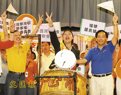 ■在動員大會上,姜淑敏(中)在曾鈺成和葉國謙的陪同下,擊鼓壯行,寓意補選馬到功成。本報記者潘政祁 攝