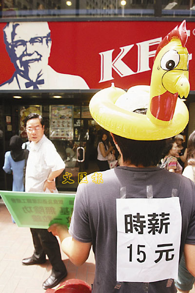 職工總會在今年4月訪問麥當勞、肯德基、Pizza Hut、大家樂、大快活、美心、吉野家職工,發現大部分快餐店採用時薪制,平均時薪17元,其中肯德基位列低薪公司的榜首,平均時薪僅15.7元,員工每月收入約3,000元。職工總會幹事卓素莧表示:「這些連鎖快餐有1、2萬工人,一個月只有3,000多元(薪金),時薪僅15.7元,是好嚴重的,政府應該立法訂定最低工資,一些傳統的立法,保障到包括飲食、清潔、保安的低薪工友。」