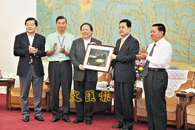 ■河北省長季允石(右二),省委常委、總工會主席臧勝業(右一),香港特區何志平局長(中),香港代表團團長陳振彬(右四)在互相贈送禮物。本報記者王海軍 攝