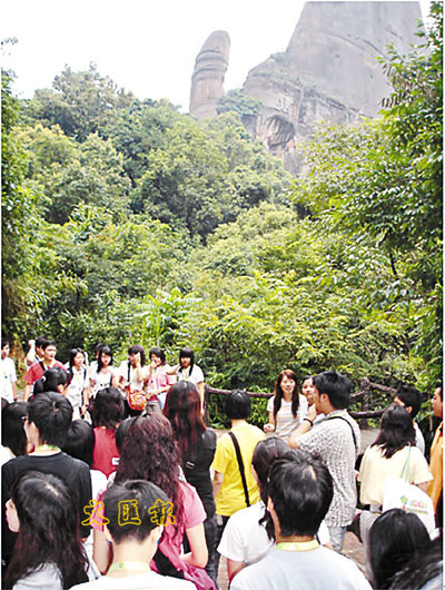 ■香港學生在韶關丹霞山的陽元石景點前留影。