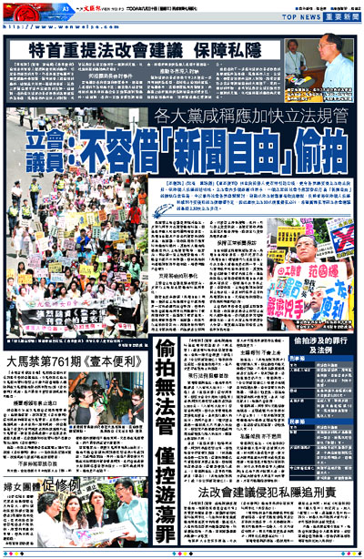 【本報訊】(記者 葉詠儀)《壹本便利》刊登偷拍藝人更衣照引起公憤,更令各界感受到立法防止偷拍、保障個人私隱的迫切性。立法會內多個政黨均表示,一個正常的社會不應該容忍打著「新聞自由」的旗號任意妄為,今次事件社會各界齊聲聲討,卻難以依法對肇事者做出嚴懲,反映香港保障個人私隱和權利不受侵犯的法律嚴重不足,因此盡快立法加以規管勢在必行,希望當局在早前法改會建議的基礎上加快立法步伐。
