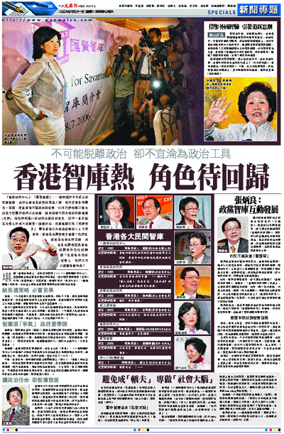 「智經研究中心」、「匯賢智庫」……這兩個於今年成立的民間智庫,由於主事者是政界的焦點人物,格外受到各界關注。其實,隨著香港代議政制的發展,90年代開始漸次催生出並不從屬於政府以及政黨,擁有相對不同目標的民間智庫﹔但他們所進行的研究及提供的意見,似乎一直未能在社會上形成大的影響。儘管如此,民間智庫仍然「愈開愈多」,關注香港公共政治發展的人士不禁思考:香港是否需要更多智庫?他們在香港是否有生存空間,或者是否需要因應香港的需要作定位的調整?在香港未來的發展上,他們又可以擔當甚麼角色?