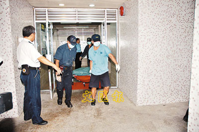 ■疑焗死在水錶房的男子屍體,由仵工舁送殮房。