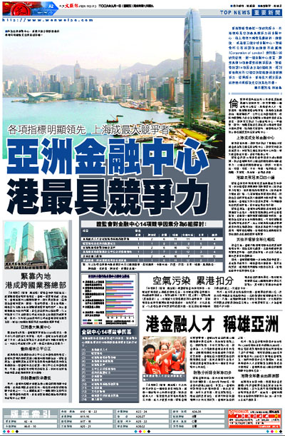 香港證監會最近一項研究顯示,本港現時是亞洲最具競爭力的金融中心,但上海很大機會是繼紐約、倫敦後, 成為第三個全球金融中心。證監會昨公布的該項由倫敦市政當局(Corporation of London)委託進行的研究發現,對一個金融中心而言,需要具備14項最重要的競爭因素,證監會將該14項因素分為6個組別,探討香港與另外12個亞洲經濟體的相對競爭力,結果顯示,香港在大部分因素的表現均明顯領先亞洲其他市場。