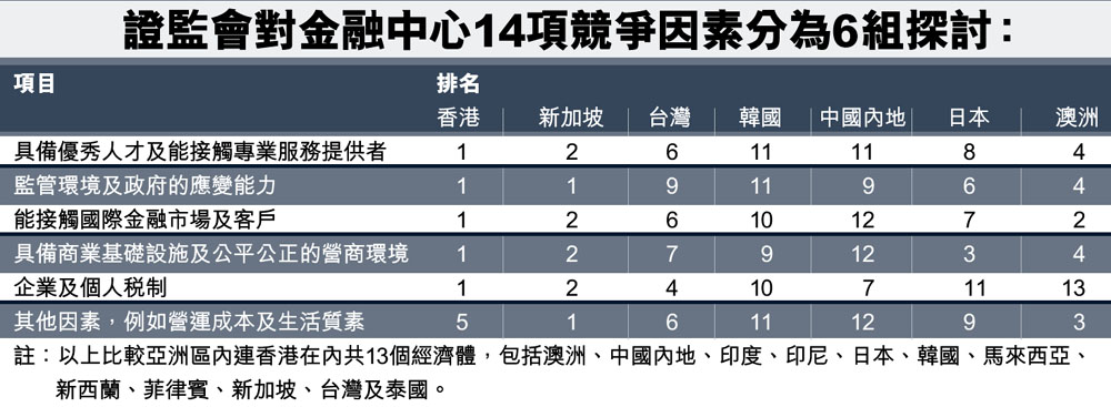 證監會對金融中心14項競爭因素分為6組探討: (圖)