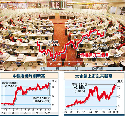 美國聯儲局再度加息機會大減,刺激外圍股市全面造好,亞太區股市普遍上升。日股急升268點,刺激港股連續第三個交易日上升,在期指結算後走勢持續強勁,恆指高開111點後,一度升穿17,400點高見17,422點,最多升138點,逼近17,500點關,恆指收巿報17,392點,升107點,全日總成交283億元。九月期指收報17,378點,升105點低水14點,合約成交3萬多張。八月份恆指累計升421點,是連續第三個月上升。自6月中低位至今2個半月以來,恆指累升2158點,升幅達14%。