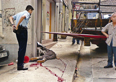 【本報訊】「排隊聽保健講座,卻招殺身禍!」一輛車尾附設升降鐵板的5.5噸貨車,昨停泊在西營盤第三街斜路準備載貨期間,疑年近7旬的司機落車前未拉緊手掣,致貨車突然溜後衝向對面行人路;年邁的司機見狀,雖在第一時間跳上車欲拉緊手掣,惜疑因煞掣系統失靈,致令貨車恍如一匹脫韁馬,衝向一群排隊輪候聽保健講座的長者始停下。意外中,一名老婦慘遭車尾的升降鐵板攔腰鍘死,另有3名老婦受輕傷送院。