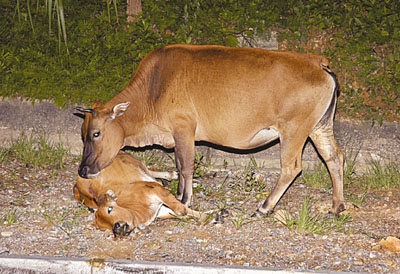 【本報訊】一頭身長1米的小黃牛,昨凌晨跟隨母牛橫過馬路時,被一輛的士撞倒,捲入車底。消防員到場把小黃牛救出,可惜已返魂乏術;母牛難掩喪子之痛,事後不停在小黃牛屍體邊悲鳴,舐犢情深,令人感動。