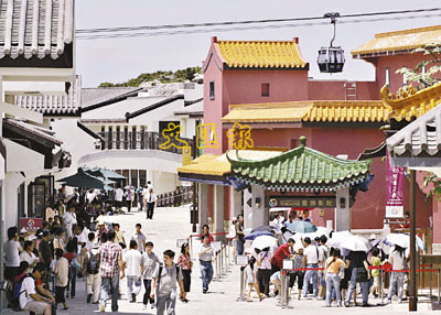 ■昂坪纜車續試運,市集內人流明顯增加,試搭人士都認為體驗不俗。本報記者高仲明攝