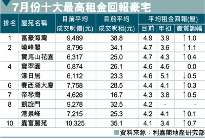 【本報訊】淡季過後,買家重現市場,並對豪宅物業需求殷切,令豪宅呎價持續上升;在租金升勢放緩的情況下,租金回報率稍有回落。利嘉閣地產研究部主管周滿傑表示,7月份指標豪宅平均呎價9,288元,若以平均呎租25.8元計算,則租金回報為3.3厘,與今年年初的3.4厘相比,微跌0.1個百分點。