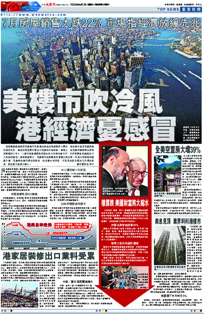 特首曾蔭權最近就美國樓市在連番加息後出現疲態表示關注,指出這可能是美國經濟放緩的先兆,最後或會拖累依賴出口美國的本港經濟。事實上,由美國前聯儲局主席格林斯潘於01年9.11事件後連番減息所催生的10年房地產牛市,目前有蹟象在連續加17次息後被摧毀。最新數據顯示,美國樓市由盛轉衰的警報已經拉響。作為全球經濟的龍頭大國,美國房地產市場的榮與枯,將牽動全球神經,尤其是極度依賴出口市場的香港,對此更不能掉以輕心。