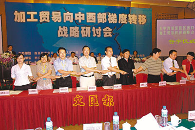 在「加工貿易向中西部梯度轉移戰略研討會」研討會上,包括海關、商務等相關部門負責人,東部部分出口加工區及中西部、東北地區已建成出口加工區管委會官員、企業代表、研究學者在內的近百位專家,就配合國家實施中部崛起、西部開發戰略,加工貿易向中西部地區轉移的可行性,進行了深入研討,並針對目前存在的主要問題,進行了分析並提出了許多政策建議。
