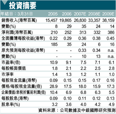 考慮到神州數碼(861)07財年(截至07年3月31日)第1季度業績優於預期,我們將07和08財年銷售收入預測分別上調12%和16%。目前股價僅為7.1倍的08財年市盈率,估值頗具吸引力。基於08財年每股收益和9倍的市盈率,我們得出目標價格3.42元港幣(昨收2.74元)。維持對該股優於大市評級。