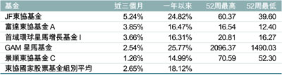 佔近三個月以來榜首的JF東協基金,在2003、2004和2005年表現分別為76.37%、8.79%及14.83%,平均市盈率和標準差為13.31及19.04。