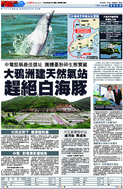 【本報訊】(記者 羅敬文)中電斥資80億元在大鴉洲發展液化天然氣接收站,以趕在2011年投產,達致減排目標。但這一選址,需要花費15億元鋪設40公里長海床輸氣管道,接駁至龍鼓灘發電廠。中電常務董事阮蘇少湄稱,這一選址是由於龍鼓灘附近居民強烈反對興建氣站,對環境和電費影響輕微;但環保團體卻炮轟,該計劃把本港碩果僅存的生態寶藏粉碎,趕絕中華白海豚,要大自然付出不可彌補的代價。