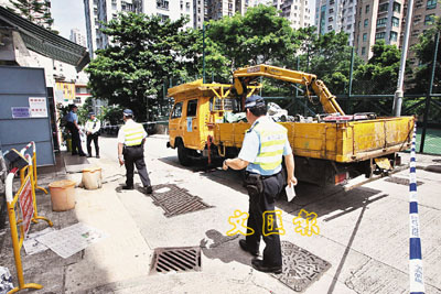 ■工程車倒後輾斃兩父女,警方封鎖現場調查。本報記者蔣焯文 攝