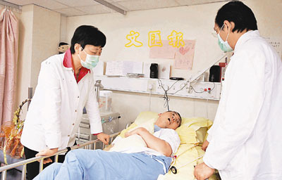 ■凌鋒(左)表示,如有需要她會專程到廣州會診。圖為今年四月她專程來港與廣華醫院醫生為朱振國會診。 資料圖片