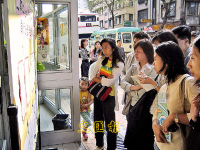 ■父母對子女能否入讀心儀小學非常緊張。圖為家長一早到喇沙小學看派位結果。 資料圖片