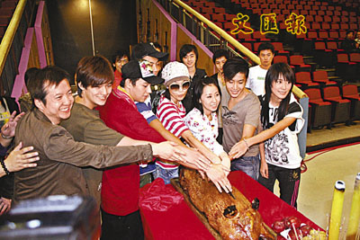 【本報訊】「英皇新秀歌唱大賽2006」昨晚舉行,為求演出順利,八位參賽者連同表演嘉賓包括容祖兒、鄭希怡、泳兒及Sunboy'z等,於傍晚時分進行拜神儀式。其中祖兒自言很有興趣做新秀評判,因她近年多是做表演嘉賓,同時每年都有留意身邊人物,以幫手發掘新人。