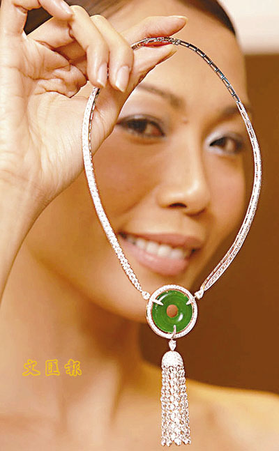 ■佳士得百周年紀念拍賣預展,模特兒展示全球只此一件,全場最珍貴翡翠及鑽石項鏈。 本報記者李志樑 攝