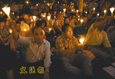 ■專線小巴聯合總商會主席梁雄與何俊仁等出席燭光晚會。本報記者潘政祁 攝