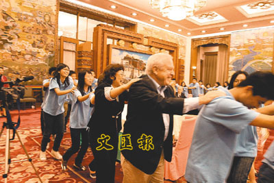 ■晚宴上與會嘉賓和同學一起玩「火車鑽山洞」的遊戲。
