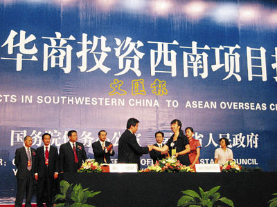 隨著中國東盟自由貿易區建設進程的加快,華商對華投資的熱情進一步高漲。來自東盟和亞太19個國家和地區的180多名華商和雲南、四川、重慶、廣西、貴州的120多家企業,日前在第4屆東盟華商投資西南項目推介會上,共簽下36項合作協議,金額達到17.3億美元。