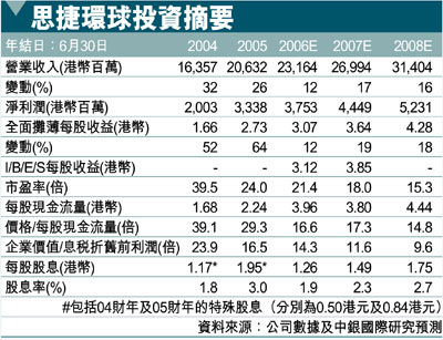 思捷環球(330)將於9月13日公告06財年業績。我們預計06財年銷售收入同比增長12%至230億元港幣,在此基礎上利潤也同比增長12%至37.5億元港幣。鑒於公司財務狀況出色(截至05年12月底淨現金為15.5億元港幣),管理層可能會像前幾年一樣,除了派發正常股息之外還派發特殊股息。全年派息率將從40%提高到70%,每股派息達2.19元港幣,股息率為3.3%。市場預測公司利潤在38億元港幣左右。