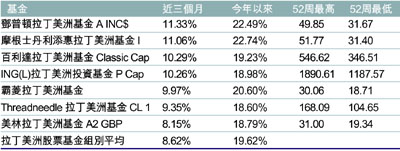 佔近三個月以來榜首的鄧普頓拉丁美洲基金,在2003、2004和2005年表現分別為71.52%、47.66%及37.81%,平均市盈率和標準差為8.97及22.03。