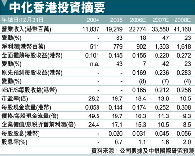 根據業績報告更新的盈利模型,我們將中化香港(297)06-08年每股收益預測下調4-8%。雖然鉀肥進口談判的拖延會給公司帶來負面影響,但是我們認為這種影響不會持續很長時間。作為中國最大的化肥經銷商,公司將從日益擴大的市場需求中獲益。即將對母公司所持鹽湖鉀肥(000792.SZ/人民幣18.50,優於大市)股份進行收購也會成為每股收益增長的推動力。我們對該股維持優於大市評級,但是將目標價格從3.40港幣下調為3.10港幣(昨收2.85元)。