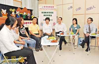 財政司司長唐英年近期似乎全心全意地應付針對開徵商品及服務稅的責難,不過,除了稅收的問題外,財爺還身負另一重任—擔任扶貧委員會的主席。為免「厚此薄彼」,財爺昨日下午特地訪問香港單親協會,與單親家庭會晤,以深入了解他們為協助單親家長面前困難時所提供的支援服務,而令他印象最深的,是這批單親家長以身作則,令子女明白自強和互助的重要性。