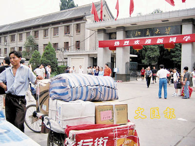 ■北大開學,新生和家長忙於拉著一車車的行李到學校,當中包括親朋戚友所送的禮物。 本報北京新聞中心記者奕峒 攝