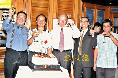 ■王柏源主席(左一)、鍾逸傑等於晚宴上切蛋糕,慶祝外展訓練學校同學會成立35周年。