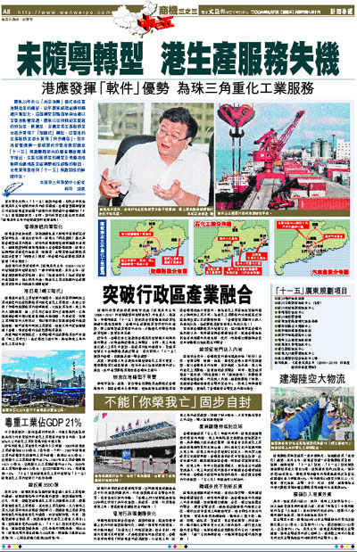 廣東20年來以「前店後廠」模式承接香港製造業的轉移,近年廣東經濟結構明顯趨向重型化,這個轉變對整個華南地區以至香港影響深遠。廣東以往與輕紡業配套的物流業、航運業、金融業等生產服務業也逐步實現了「飛躍式」轉型,但香港的生產服務業卻未實現「同步轉型」。受本港智囊機構—智經委託作香港應對國家「十一五」規劃專題研究的粵省專家陳鴻宇指出,生產性服務業的轉變正是粵港推動兩地區域產業結構戰略性調整的動因,也是實現香港與「十一五」規劃對接的關鍵所在。