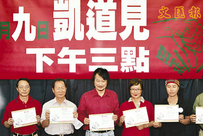 ■施明德(中)7日宣布,9月9日下午3時,要參加靜坐的民眾凱達格蘭大道見。 中央社
