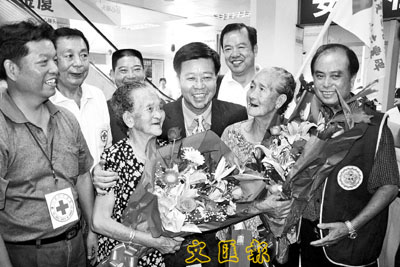 金門和廈門海峽兩岸離散家族跨海會親團圓活動昨日在廈門市舉行,金門縣長李炷烽(中)與離散兩岸金門鄉親相聚在一起,歡喜他們團圓。 中央社