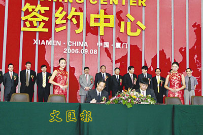 ■太古飲料購廈門太古可口可樂飲料中方股東的全部股份。圖為合同簽字儀式。 本報記者米南 攝