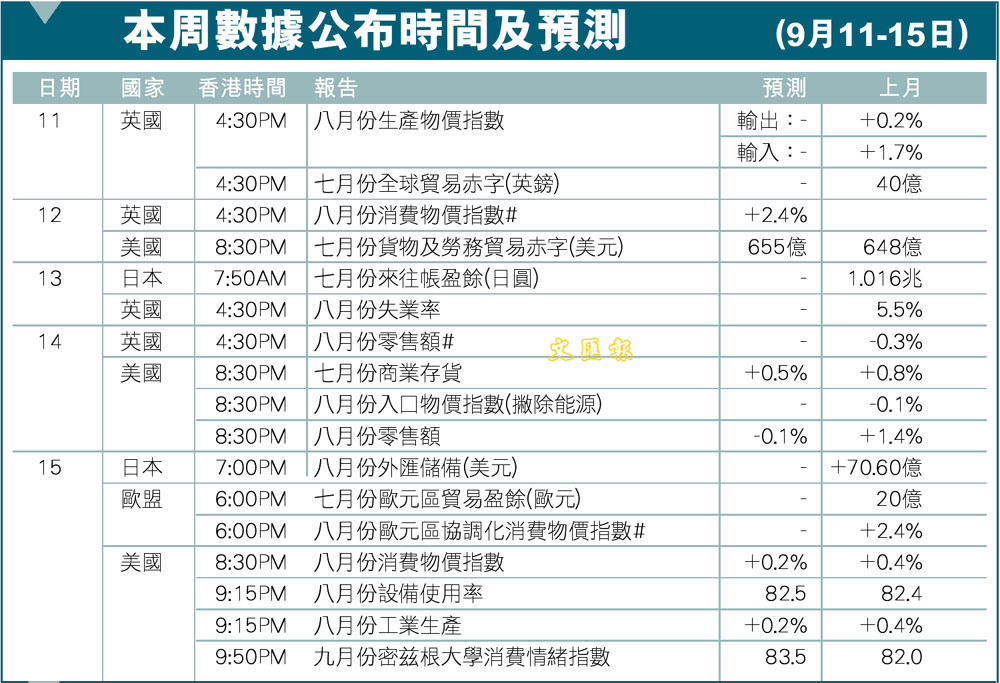本周數據公布時間及預測(9月11-15日) (圖)