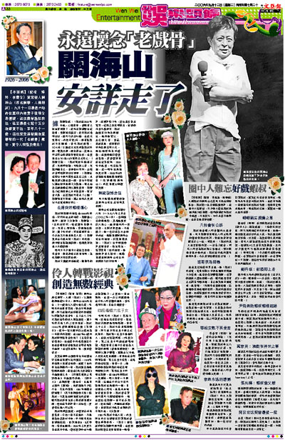 【本報訊】(記者 焯羚、李慶全)資深藝人關海山(原名關寧,人稱蝦叔),九月十一日清晨六時許在寓所內被妻子發現全身僵硬,送往廣華醫院救治,延至清晨七點十五分後證實不治,享年八十一歲。這位深受演藝圈後輩尊敬的一代「老戲骨」離世,實令人惋惜及懷念!據蝦嫂憶述:「蝦叔在2001年中風,心臟有事,曾經有三條血管閉塞了,近年定期到醫生處檢查,身體情況穩定,近月蝦叔精神好好,還可以扶著行路。最近天氣轉冷,前晚半夜3時,都有提蝦叔不要踢被,當時蝦叔還答:『OK啦!』臨近天光我再摸蝦叔的面,發覺好凍,面色蒼白,於是立即召來白車到廣華醫院急救,最後延至上午7點15分宣佈正式死亡。」蝦嫂又說:「蝦叔離世時臉容安詳,我都同佢講,叫佢放心走,我識照顧自己,會睇住仔像漶A老婆亦會同佢辦得好好睇睇。」蝦嫂最遺憾兒子關可維身在北京工作,未能見到父親最後一面。當兒子知道父親去世消息都十分難過,現正由北京趕返港處理父親身後事。蝦嫂全力處理有關亡夫的身後事,暫定會火葬。至於蝦叔可有未了心願?蝦嫂坦言不知道,總之他每次見到兒子及徒弟都好開心。