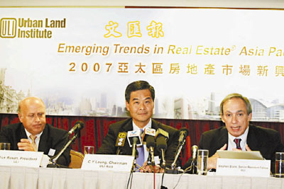 ■美國城市土地學會房地產融資部高級常駐研究員Stephen Blank(右)及戴德梁行主席梁振英(中)回答傳媒訪問。 本報記者張偉民 攝