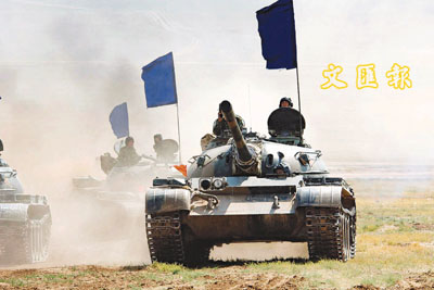 9月13日,北京軍區所屬兩支部隊的坦克分隊,利用激光交戰模擬訓練器材在某戰術訓練基地進行了實兵對抗性演練。 中新社