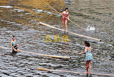 獨竹競渡是貴州省遵義地區一項瀕臨失傳的傳統絕技,操作者赤腳踩著一根長6米左右的粗大楠竹,用一根細竹竿為槳橫渡江河。曾是當地人交通工具之一的獨竹競渡,如今成了人們時尚的健身娛樂項目。圖為幾位市民在遵義市中心的湘江河中練習獨竹競渡。 新華社