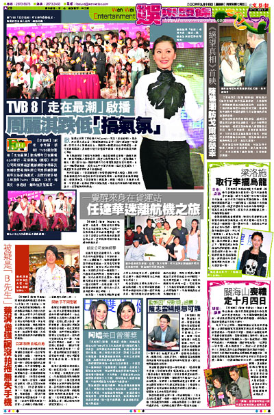 【本報訊】(記者 李思穎、蔡敏)TVB8登陸香港「走在最潮」啟播禮昨日在觀塘apm舉行,電視廣播(國際)有限公司電視頻道營運部總監李德基及無線收費電視有限公司常務總裁陳錫年主持啟播儀式,出席的歌手藝人包括有Twins、周麗淇、泳兒、蔣雅文、李逸朗、鄭希怡及草蜢等。