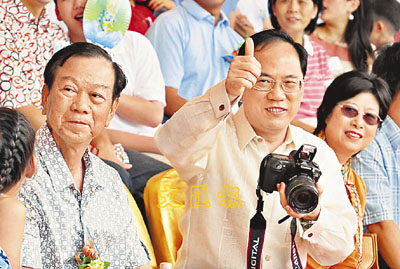 ■曾特首是一名攝影愛好者。圖為早前主禮屯門龍舟賽時,拿著相機的他拍攝後豎起大拇指向記者們示意。資料圖片