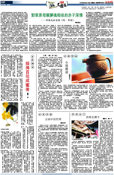 《啊,草原》,是用天然、天籟、天香、天情、天高、天星、天意等意象組成的詩集,以此可窺視到詩人對內蒙古大草原、華夏神州,對祖國這個廣義上母親的摯愛之情。如《胸懷》:「草原的遼闊讓人震撼/有了遼闊才有百花爭艷/草原的胸懷寬廣無限/有了寬廣才有草原的壯美高天/無垠的遼闊/寬廣的氣魄/博大的胸懷/永遠的純潔/那是草原美的真諦/那是草原人的性格/那是草原母親的聖潔/那是生命草原的本色」。《胸懷》是音樂宇宙的琴聲,是生命與天地的諧奏,是心靈與自然的共鳴,因此詩人唯有沉浸、融入其裡而放聲高歌。又如《母親》:「那是一座高山/頭頂著白雲藍天/那是一條大河/像乳汁澆灌著生活/那是一片大海/望不盡的寬闊胸懷/那是日月星辰/永遠照耀著乾坤」。此詩令人想起著名的《敕勒歌》:「敕勒川,陰山下,天似穹廬,籠蓋四野。天蒼蒼,野茫茫,風吹草低見牛羊。」此詩語言簡練質樸,音調雄壯,風格明朗豪放,雄渾天成,是描寫草原的千古絕唱。《啊,草原》中吟唱草原母親的詩,頗多令人一唱三歎的絕唱之作。