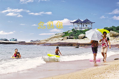 ■發生地震後,擔杆島上居民生活正常,小孩子仍在海邊嬉水。 本報珠海傳真