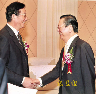 ■香港僑界社團聯會會長陳有慶出席首屆華商領袖圓桌會,與上海市市委書記陳良宇(左)會面。